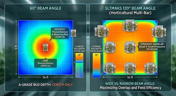 • The SLTMAKS 120° Advantage: By using a natural 120° beam angle, our grow light fixtures allow light to spread horizontally. This isn't a "weakness" at the edges; it’s a Strategic Overlap.
